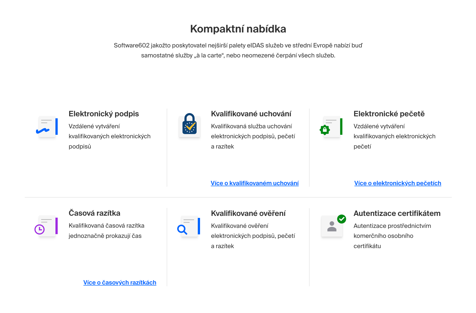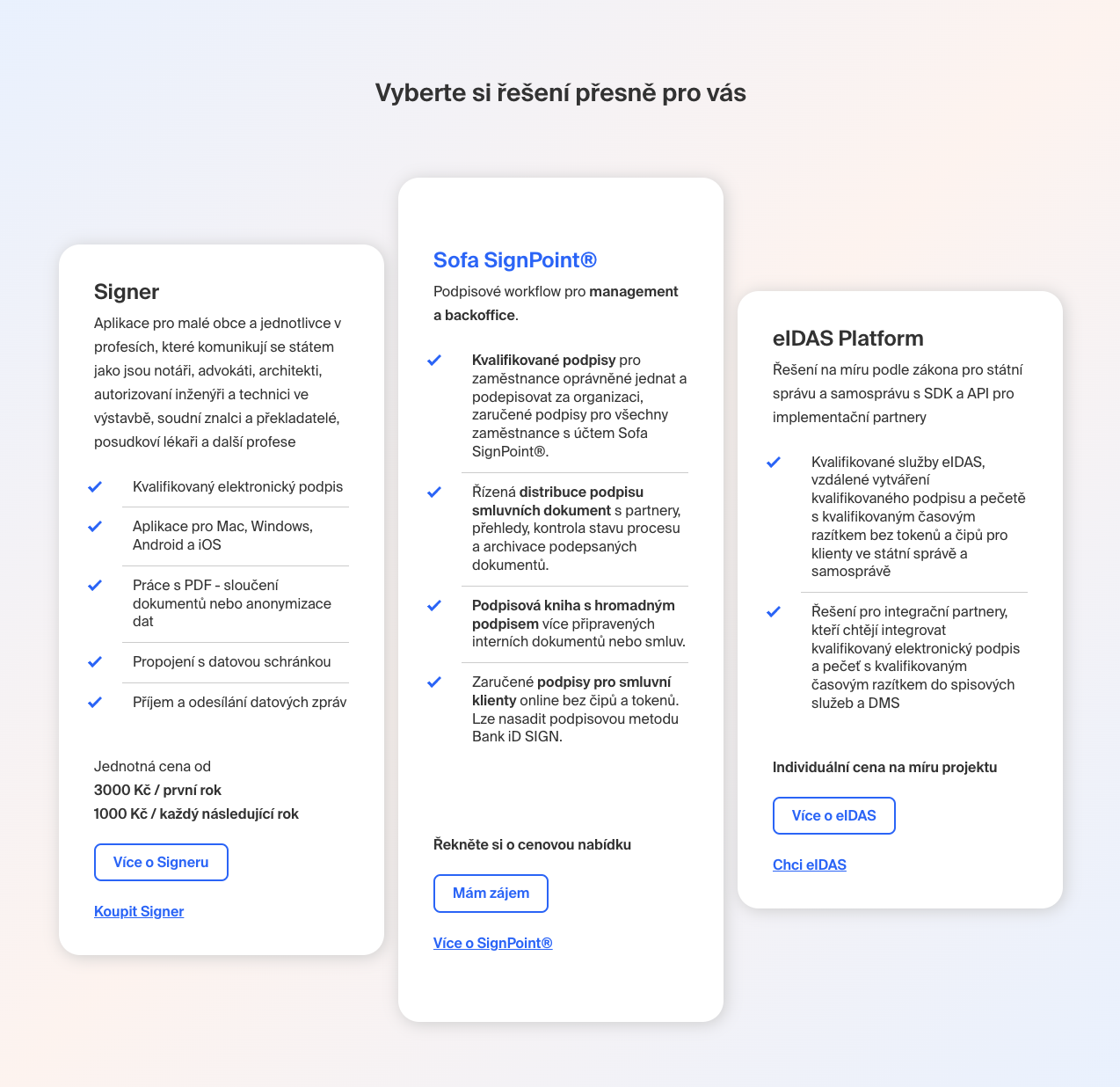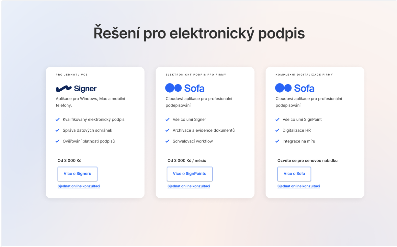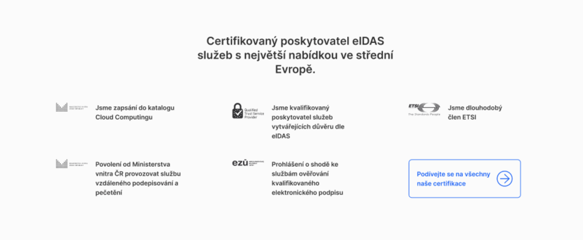 Zaručené podpisy pro smluvní klienty s jejich Bank iD přihlášením a identifikací při podpisu smlouvy. Vše online bez čipů a tokenů.