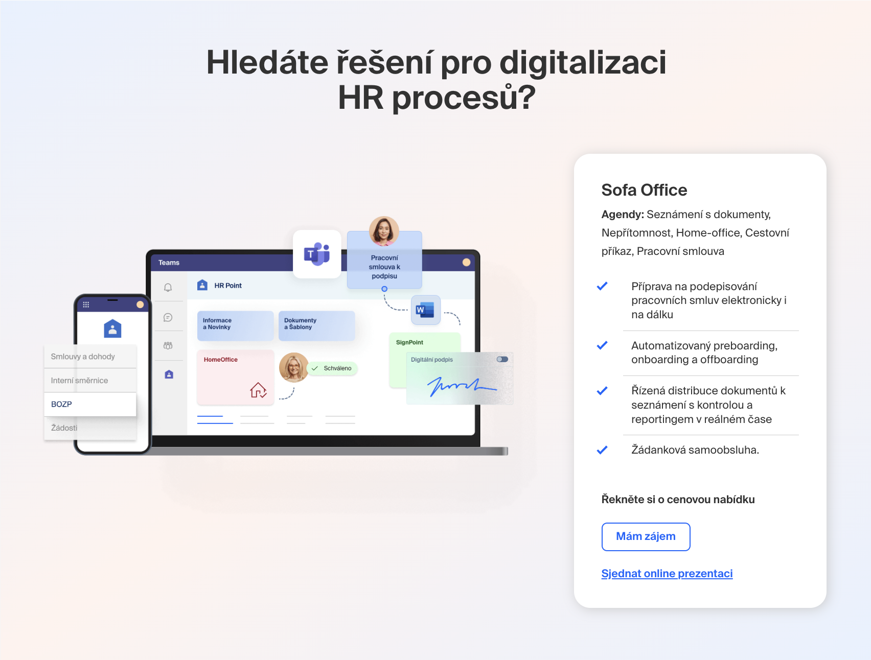 HR Point digitalizuje celou personální agendu od onboardingu až po offboarding včetně využití elektronického podpisu, digitálního archivu a online schvalování interních požadavků. Vše je nativně integrováno do aplikace Teams. Ušetřete svému HR i zaměstnancům hromadu času.